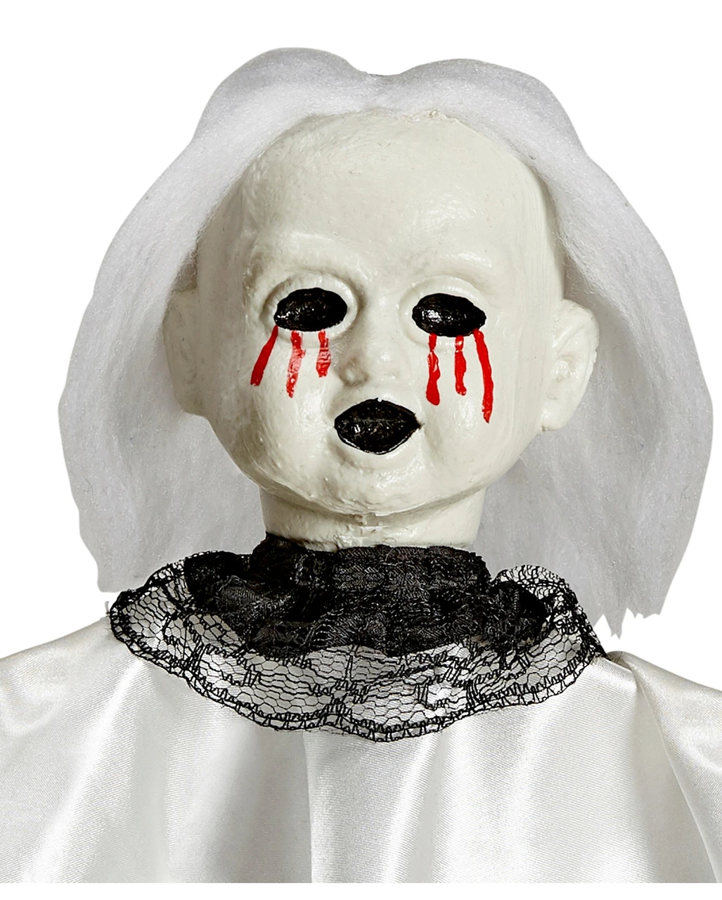 Schaurige Geisterpuppe mit blutigen Augen als Halloween Deko