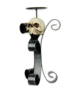 Unser eindrucksvoller Kerzenhalter mit Totenschädel bringt Friedhofsstimmung an den Tisch. Der Gothic Kerzenhalter mit Totenkopf versprüht eine unheimliche Atmosphäre, welches auf Halloween-Feten & Horror-Events zu einer schaurig-schönen Stimmung beiträgt. Der Totenkopf Kerzenständer kommt alleine oder mit weiteren Elementen, wie Deko Skulls, sehr gut zur Geltung. Besonders bemerkenswert hierbei ist der realistisch aussehende Mini-Totenkopf, welcher unheimlich über den Festtisch wacht.