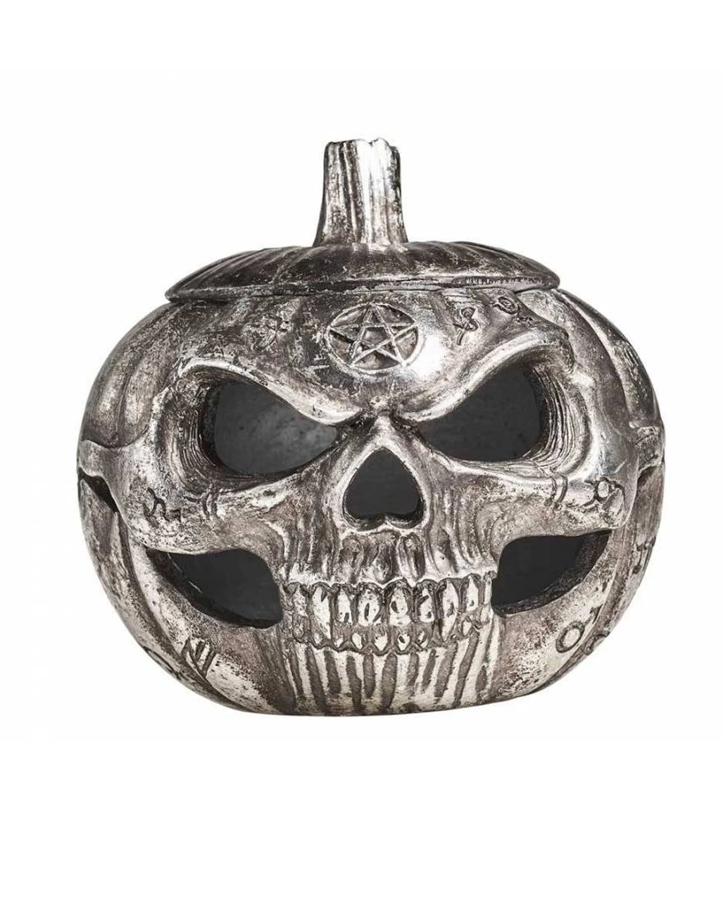 Diese einzigartige Kürbis Totenschädel Schale ist aus hochwertigem Polyresin gefertigt und von Hand bemalt. Nicht nur die schrecklichen Details wie die Zähne, das grimmige Grinsen oder das Pentagramm wirken beeindruckend. Der silbrige Antik-Effekt macht den Totenschädel zum Hingucker. Und natürlich ist das subtile Gothic Design nicht nur zu Halloween eine fantastische Ergänzung für jeden Raum. Warum also nicht ein LED-Licht hinzufügen, um die Kürbis Totenkopf Schale in ein mystisches Nachtlicht zu verwandeln!