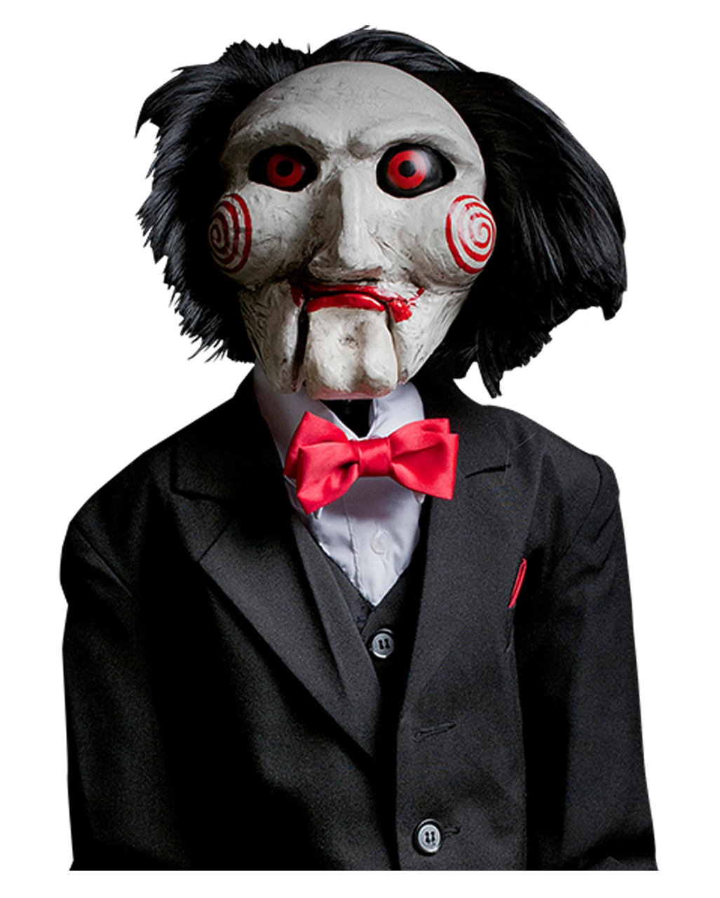 Die SAW Puppe Billy entspricht bis ins Detail der Filmvorlage. In einen schicken schwarzen Smoking gekleidet und mit 105cm auch angemessen groß, verbreitet die Saw-Bauchrednerpuppe sofort das schaurige Feeling aus der Horrorfilm-Reihe. Ein weißes Hemd, weiße Handschuhe, eine rote Fliege, rote Schuhe sowie ein rotes Einstecktuch kleiden die Jigsaw-Puppe. Die schaurige Maske mit den charakteristischen roten Hypnoserädern an den Wangen sowie langen schwarzen Haaren hinten am Kopf verleiht „Billy the Puppet“ ein furchteinflößendes Äußeres. Die Horror-Deko besteht aus Schaumstoff, sodass sie frei positioniert werden kann; zum Aufstellen benötigt sie aber eine entsprechende Vorrichtung. Weitere Saw-Fanartikel wie die Saw Tischlaternen 6 St. und die White Saw Motivlinsen haben wir ebenfalls im Karneval-Universe.de!