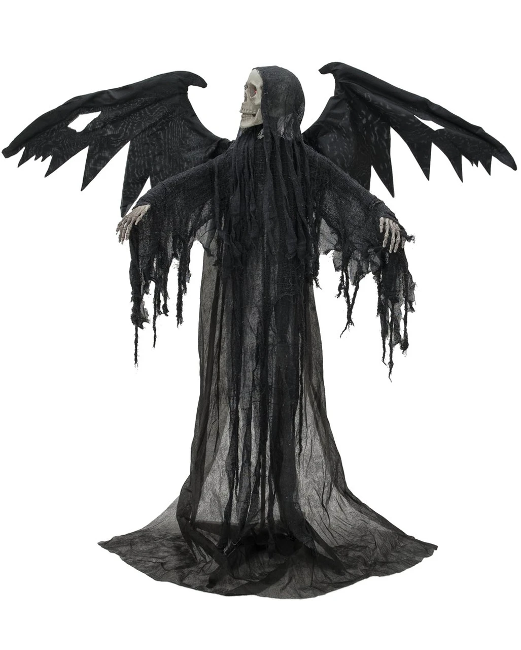 Du willst neue Maßstäbe in Sachen Halloween Dekoration setzen? Dann lade unseren schwarzen Pestengel mit Bewegung, Sound & Licht zu dir ein. Diese gruselige Deko Figur bringt selbst den stärksten Partygast zum Zittern. Mal sehen, wer sich als erstes ins Höschen macht, wenn der schaurige Skelett mit den Flügeln und dem Fetzenumhang mit den Flügeln schlägt und gruselige Laute von sich gibt. Seine Augen leuchten glutrot. Unheimlichere Geisterbahn Animatronics hat man selten gesehen.
