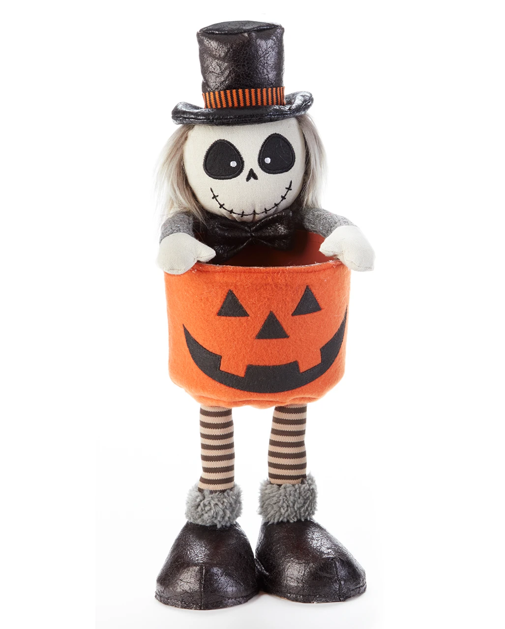Unser stehendes Skelett Männchen mit Kürbis Schale ist 39 cm groß und aus weichem Material gefertigt. Die kinderfreundliche Halloween Deko zeigt ein lustiges Skelett, das einen Zylinder trägt und einen Kürbiskorb in Händen hält. Hierin finden deine Halloween Bonbons ein hübsches Plätzchen. Entdecke noch mehr Trick or Treat Deko sowie Snackschalen bei uns im Shop. Sichere dir auch die Halloween Schüssel mit Kürbisgesicht
