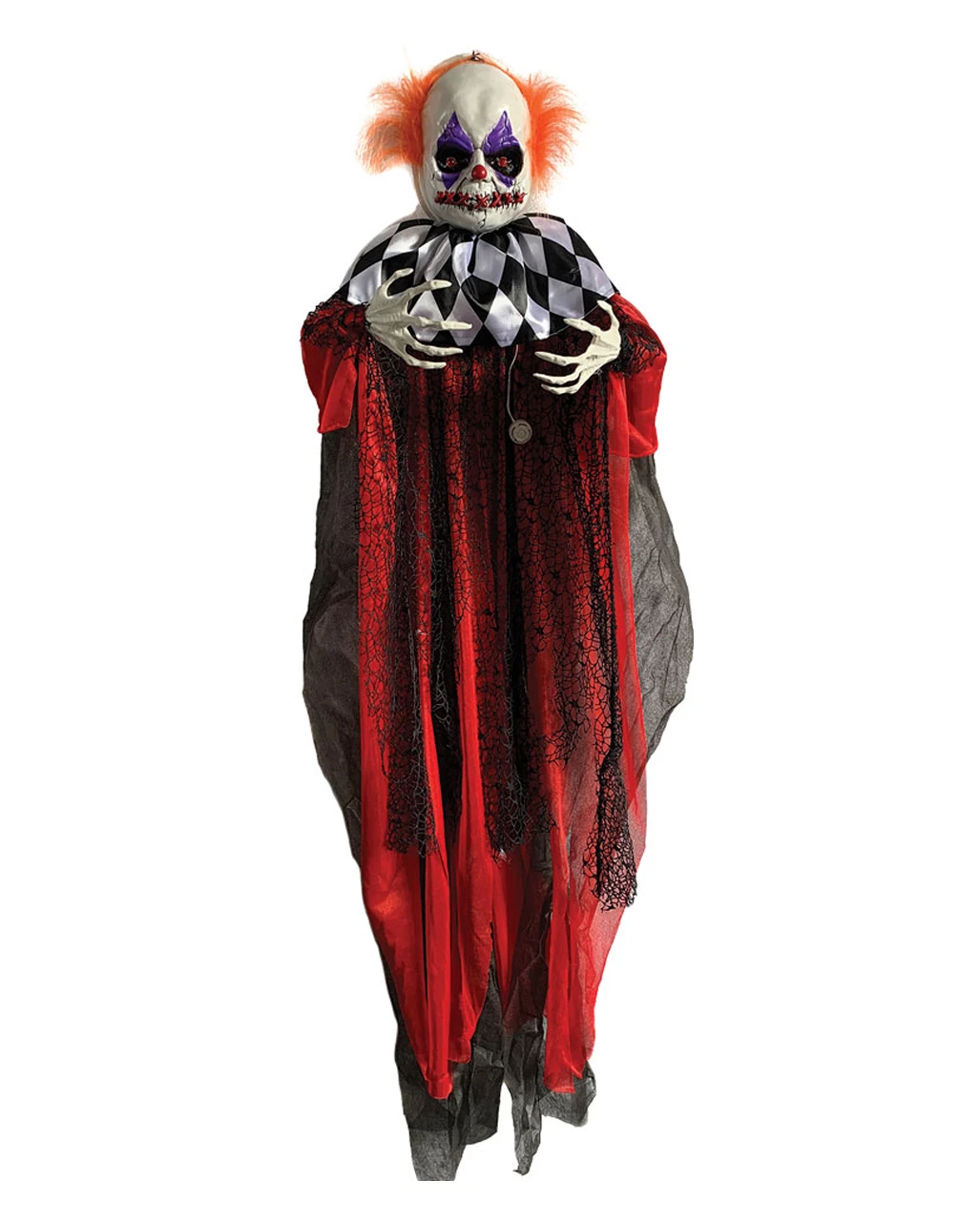 Unser unheimlicher Horror Clown mit LED Augen ist 105 cm groß und eine Halloween Deko für den Innenbereich. Die Horror Clown Deko eignet sich perfekt zum Befestigen an Decken, Wänden oder in deiner selbstgebauten Geisterbahn. Mit einem langen Fetzenkleid, knochigen Händen und einer unheimlichen Fratze sorgt der Killerclown für spitze Schreie. Dieser Horrorclown zum Hängen geht super mit unserem Evil Carnival Horrorcircus Türvorhang.